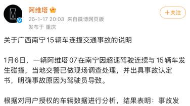 阿维塔回应连撞15车:辅助驾驶未激活