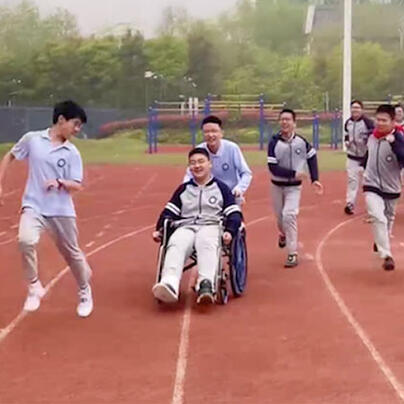 看现场这两天,杭州观成实验学校有个坐轮椅的男生火了。体育课上,一群男生在操场上跑步,可是令人惊讶的是这个坐轮椅的同学,一路“风驰电掣”第一个冲过终点。