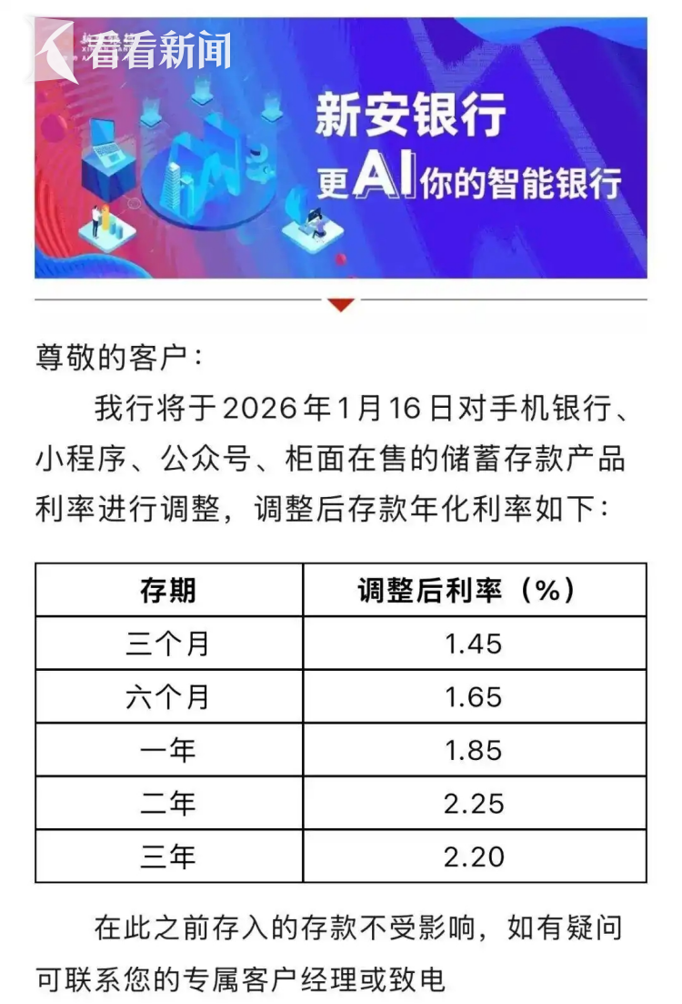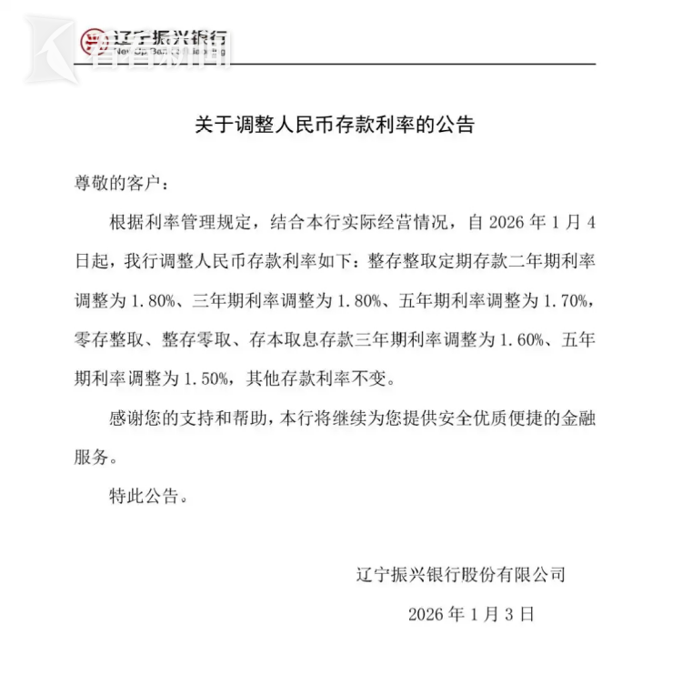 此外,一直以来被称为存款利率高地的民营银行,在进入2026年以来,降息的节奏进一步加快。辽宁振兴银行三年期、二年期利率均下调至1.80%;安徽新安银行两年期与三年期利率保持倒挂。
