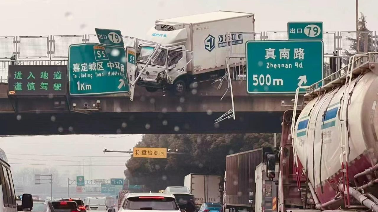 视频 | 上海S20外环高速 货车撞破防护网车头半悬空中