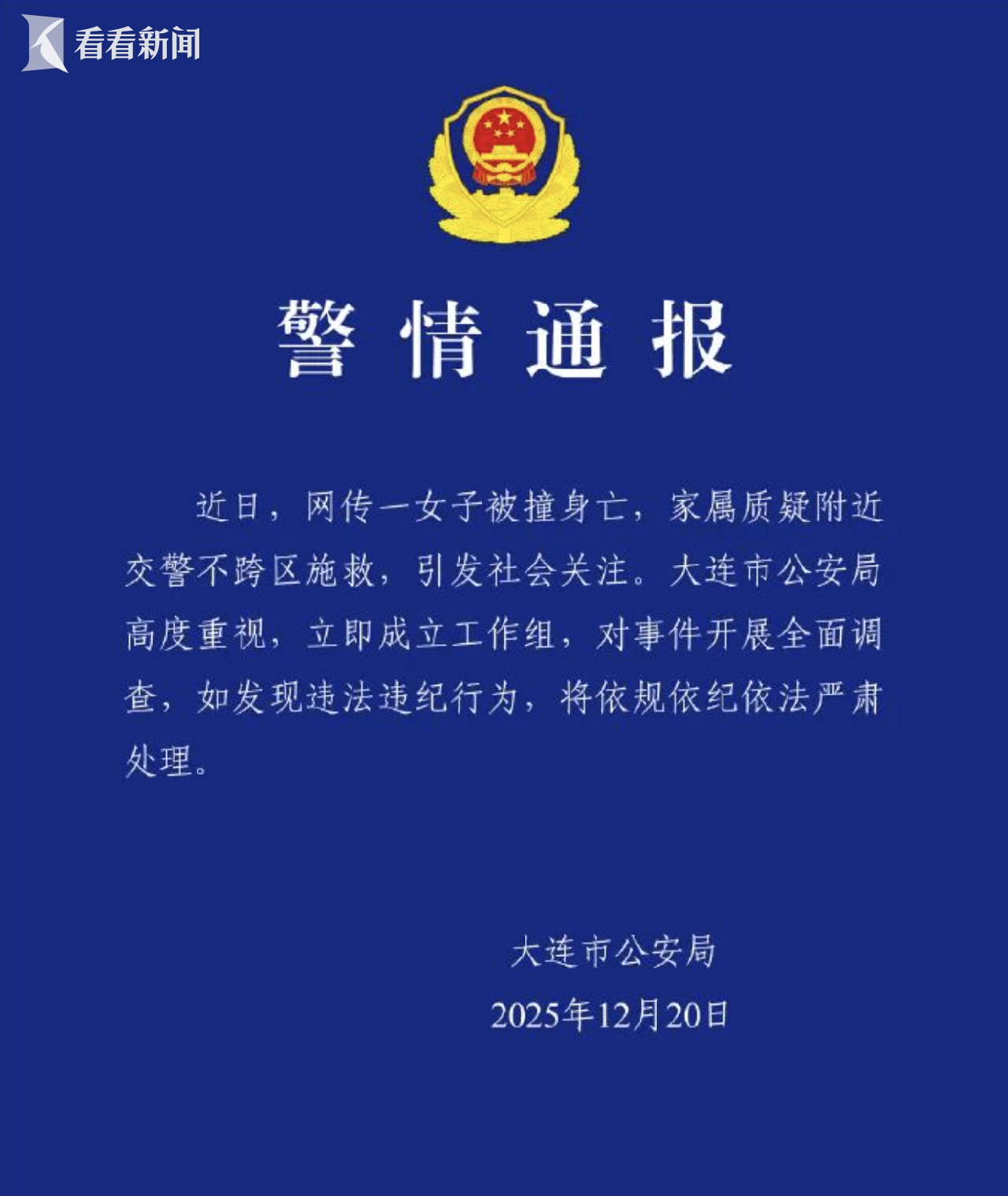 12月20日,辽宁大连市公安局发布警情通报:近日,网传一女子被撞身亡,家属质疑附近交警不跨区施救,引发社会关注。大连市公安局高度重视,立即成立工作组,对事件开展全面调查,如发现违法违纪行为,将依规依纪依法严肃处理。