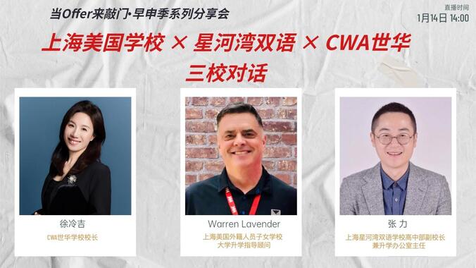 2025—2026海外大学本科申请季早申轮次放榜,《海外路路通》特别开启【当offer来敲门】系列直播分享!本场直播我们将从学校视角出发,特别集结老牌外籍人员子女学校上海美国学校、民办双语强校星河湾以及UWC体系的创新学校CWA世华学校,带大家看看它们的核心培养路径有何不同?听校长与升学指导们亲自拆解:亮眼的Offer背后,到底藏着怎样一套育人哲学与申请谋略?