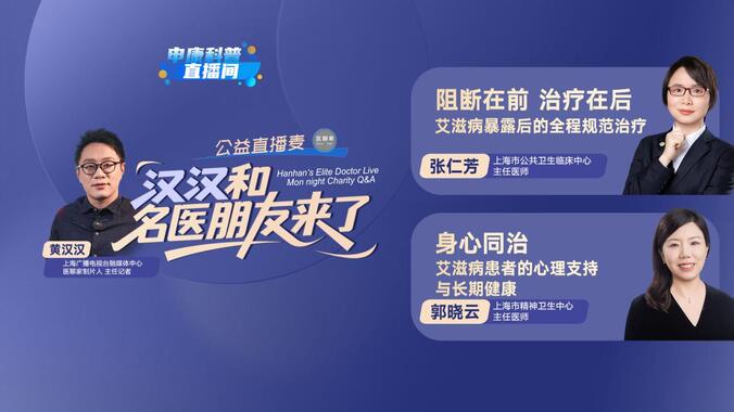 《申康科普直播间》全新板块《汉汉和名医朋友来了:周一晚公益直播麦》将在1月12日周一晚七点准时开播。艾滋病是一种需要长期管理、规范干预的传染性疾病,尽快阻断、科学用药是关键。本期节目我们邀请了上海市公共卫生临床中心主任医师张仁芳 、上海市精神卫生中心主任医师 郭晓云 ,给我们讲讲如何防治艾滋病。