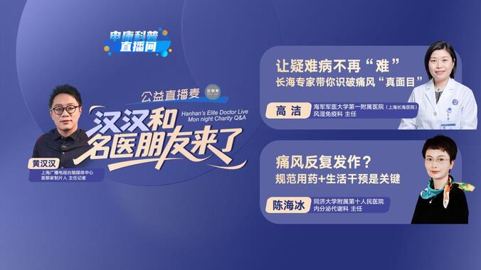 《申康科普直播间》全新板块《汉汉和名医朋友来了:周一晚公益直播麦》在4月20日晚上19点准时开播。当天是世界痛风日,在防治痛风上有什么最新进展和诊疗方案呢?本期节目我们邀请到上海长海医院风湿免疫科主任高洁,和上海市第十人民医院内分泌代谢科主任陈海冰,给我们讲讲如何科学防治痛风。