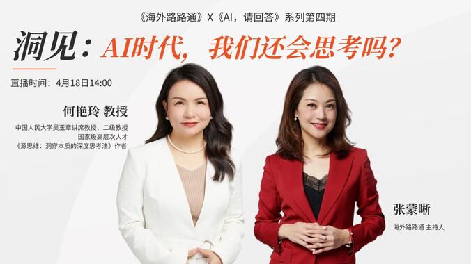 AI时代,当机器开始学习思考——能写诗、能辩论、能解数学题。我们还需要思考吗?我们还会思考吗?《海外路路通》X《AI,请回答》第四期节目特别邀请到了中国人民大学吴玉章讲席教授、二级教授、国家级高层次人才、《源思维:洞穿本质的深度思考法》作者 何艳玲教授,用深度思考帮助我们捍卫AI时代的“思考主权” ,用源思维帮助更多人守住“抢不走的竞争力”。